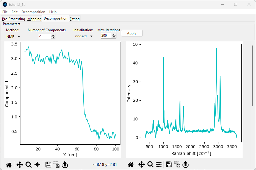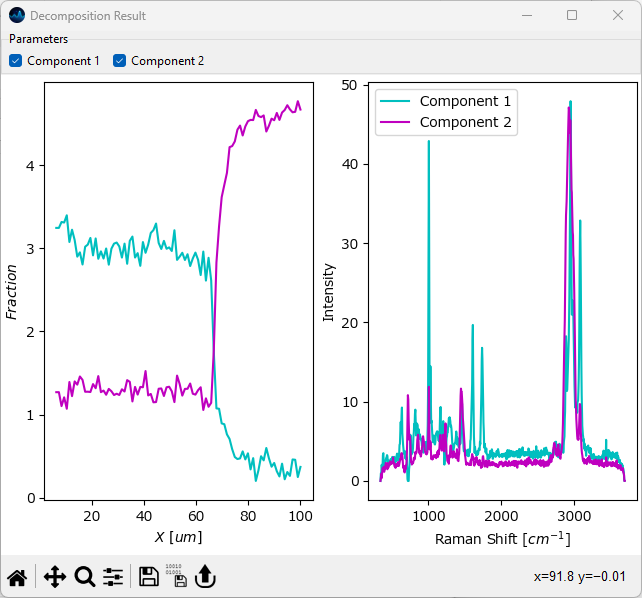 The algorithm has split the dataset into two components and extracted characteristic spectra as well as concentration profiles for each component. The first component has high intensity at low x values and starts decreasing around 70 μm. The second component starts increasing around 70 μm from a low to a high concentration. You might have to scroll down to see the second component.