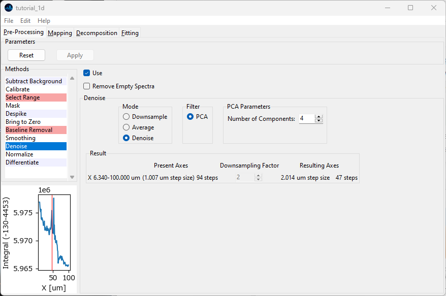 From the Mode menu, select Denoise. As Filter, select PCA. For Number of Components, select 4. Finally, activate the Denoise preprocessing step by checking Use and click Apply to perform the three active preprocessing steps.