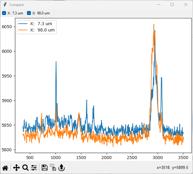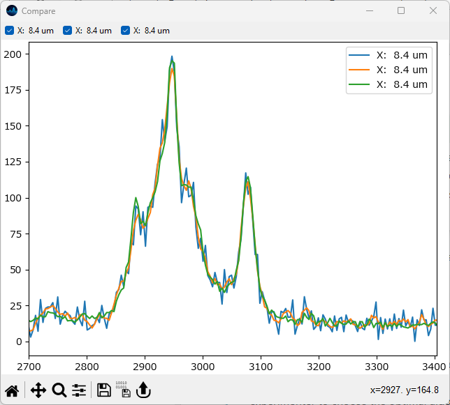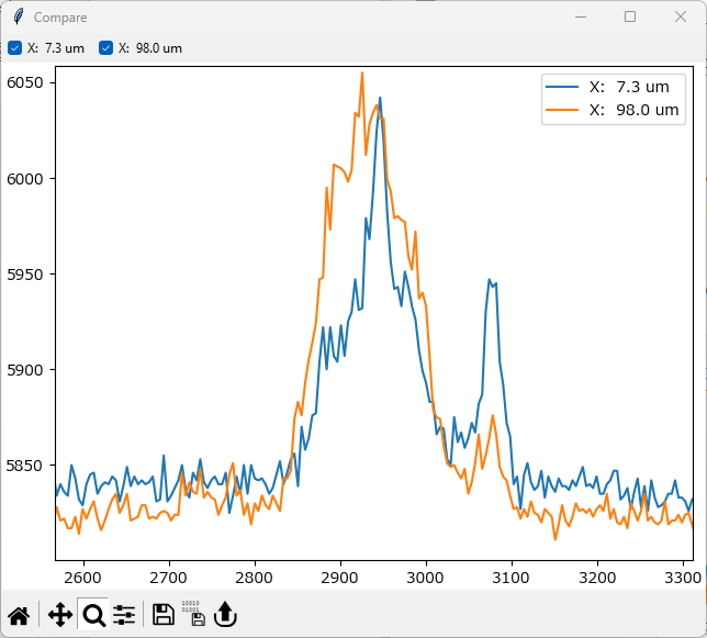 Our superficial inspection has revealed spectral differences in the CH2-stretching region of the Raman spectra around 3000 cm-1. We can visualize this in the intensity profile.