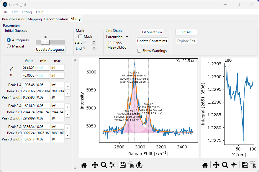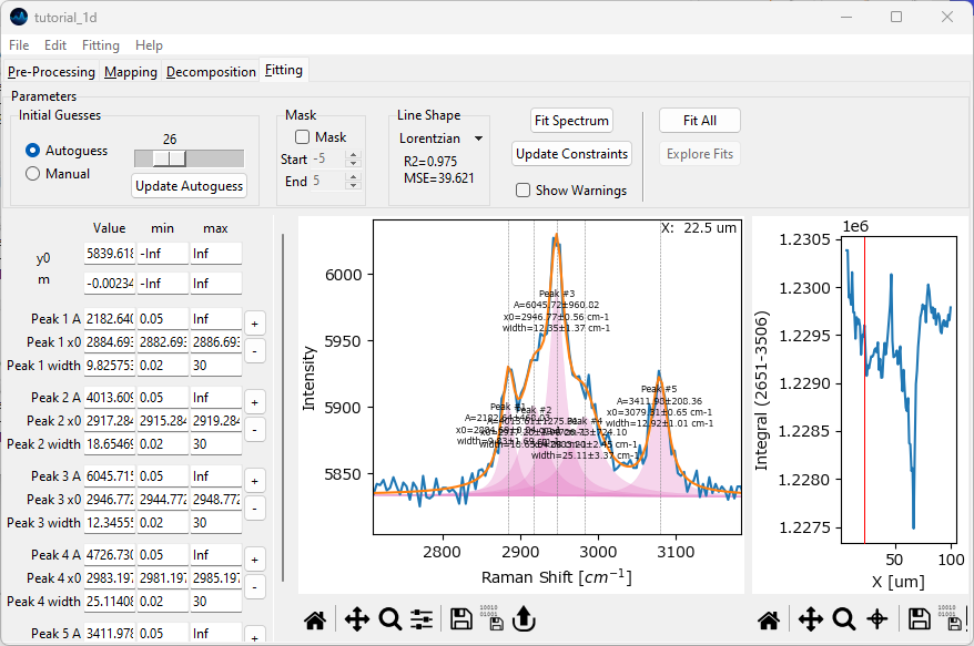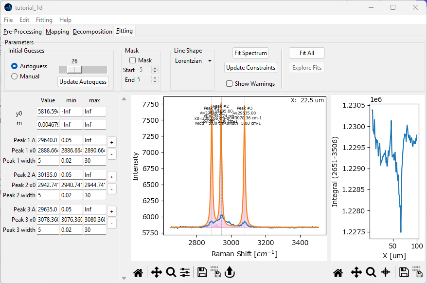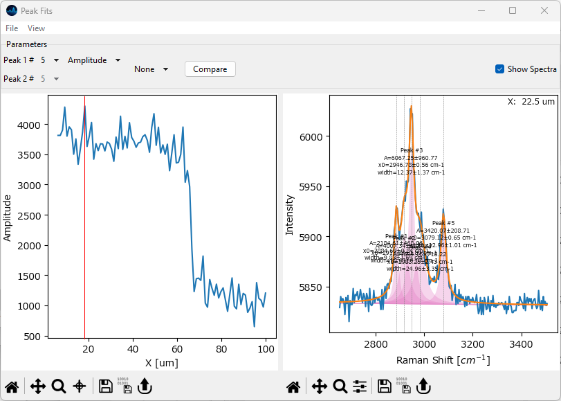 In the fitting screen, select the spectrum at x = 22.5 μm by clicking and dragging in the right-most pane.