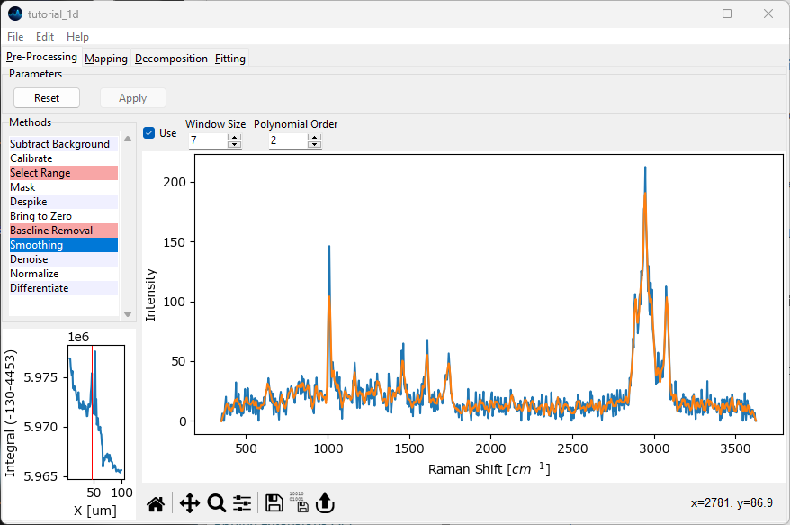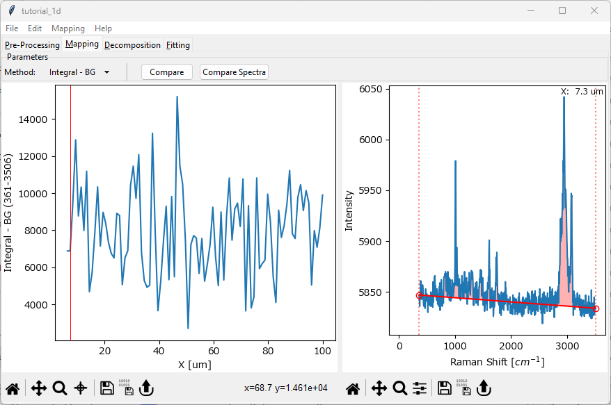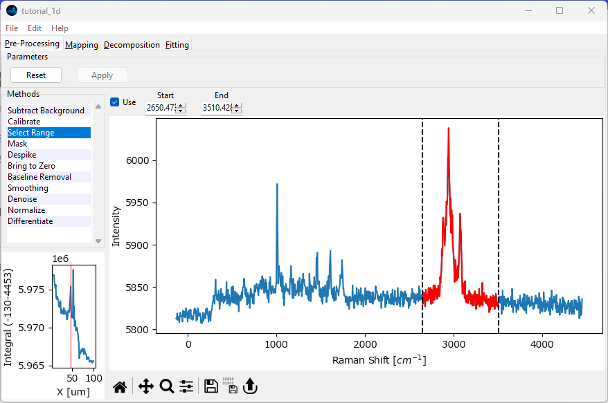 In the previous section, we have had a cursory look at the tutorial dataset. After slightly cropping the spectral range to remove instrumental artifacts, we visually identified spectral differences and plotted the integrated intensity to obtain an intensity profile.