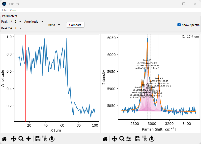 Visualize the intensity profile of the peak centered at 3080 cm -1 (the rightmost peak, peak number 5 in this example). To do this, select this peak from the Peak 1# dropdown. The correct peak number is displayed above the peak in the right-hand pane. Next, select Amplitude to plot the peak’s amplitude.