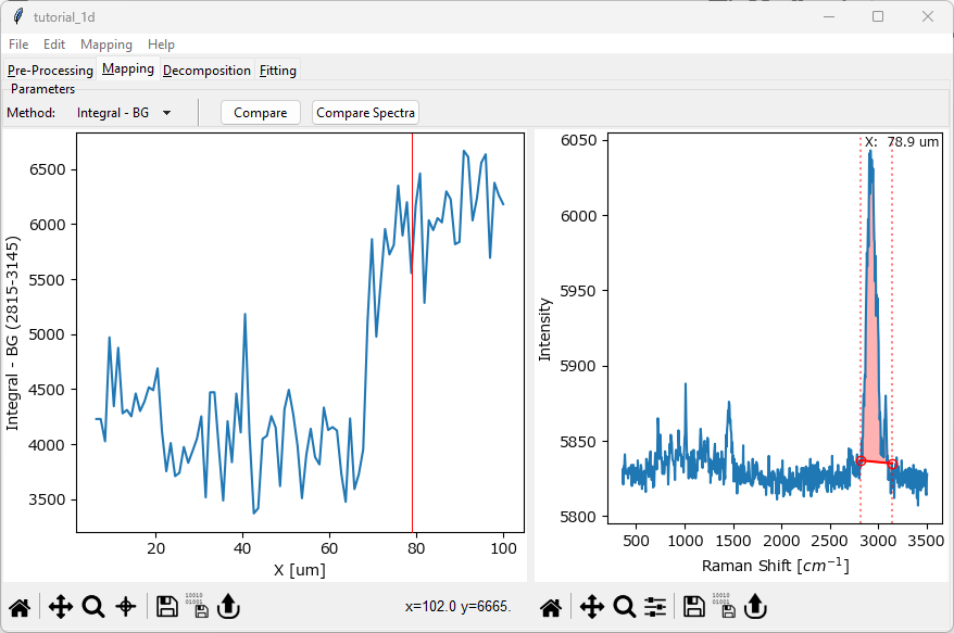 The profile in the left pane will update and display the integrated intensity in the selected region after subtracting a linear baseline between the endpoints. The integrated intensity is indicated by the red shaded region in the graph.