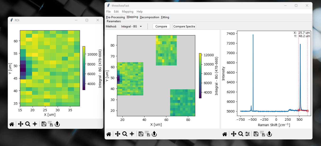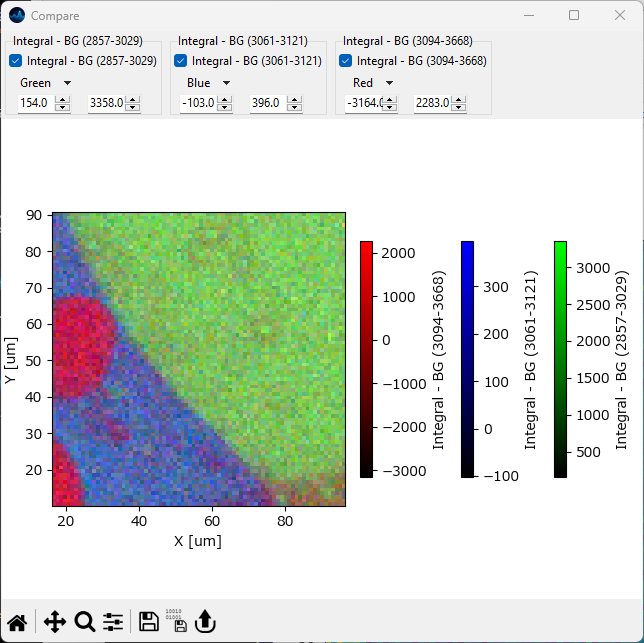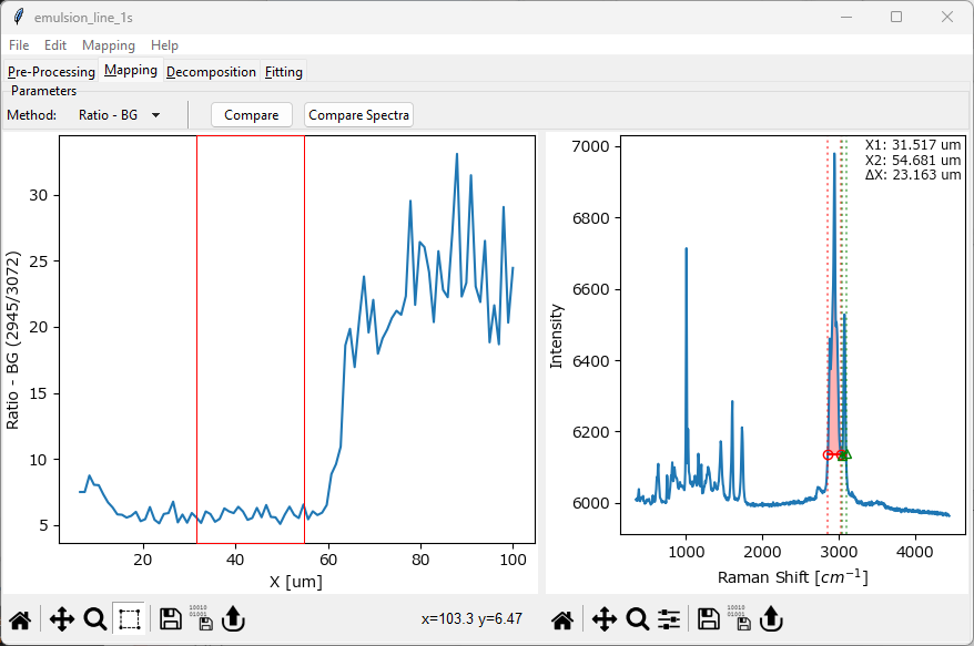 for one-dimensional or two-dimensional data, simply click on the Compare button or select . This will open a new window that contains the currently displayed mapping or intensity profile. Next, adjust the spectral range in the right pane of the Mapping window and click Compare again. This will add the newly computed mapping / intensity profile to the comparison window. This procedure can be repeated as many times as needed.