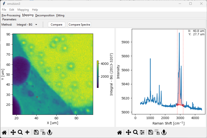 computes a running sum between the start and end of the selected spectral range and subtract the line connecting the start and end points as the baseline. The red shaded region in The Mapping Window illustrates this computation.