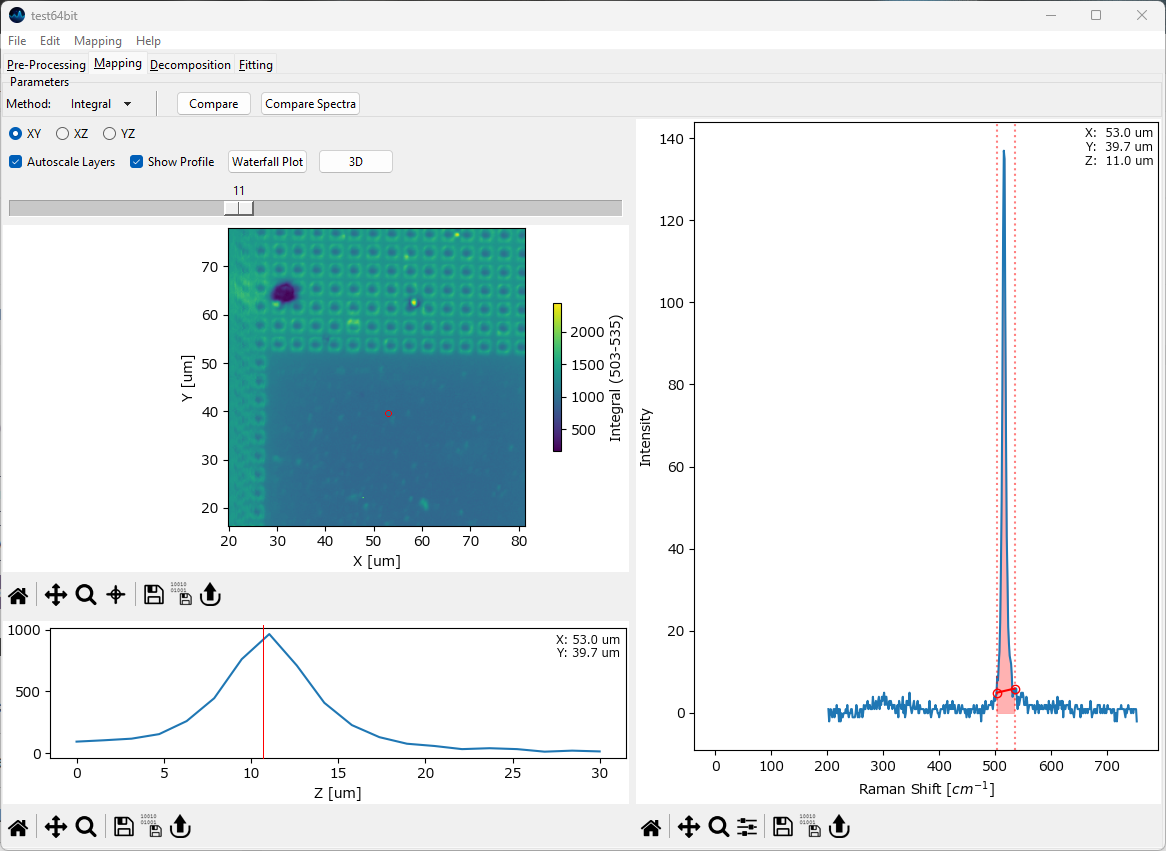 The spectrum displayed in the right pane can be selected by clicking in the mapping. The selected spectrum is indicated by a red circle (2D and 3D mappings) or a red vertical line (1D mappings). For 1D, 2D, or 3D data, you can also select to display an average spectrum rather than a single spectrum. To switch between single-spectrum and average spectrum modes, use the cross-hair toggle in the mapping toolbar and drag in the mapping / intensity profile to select a range (see The Mapping Window - Ratio for an example).