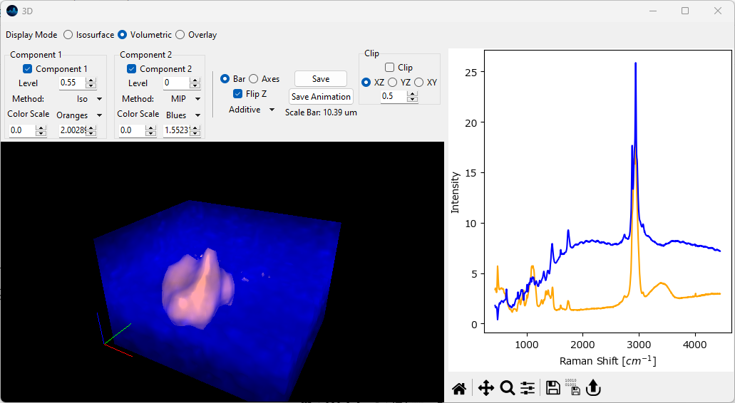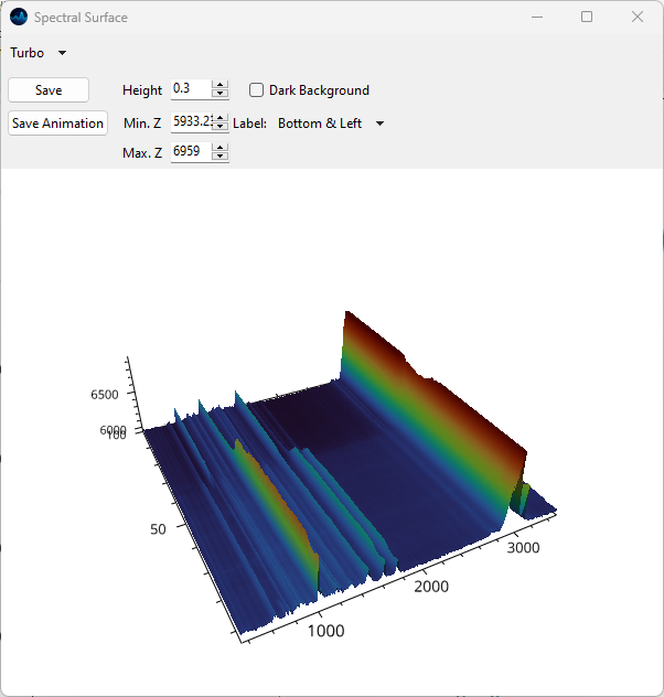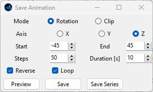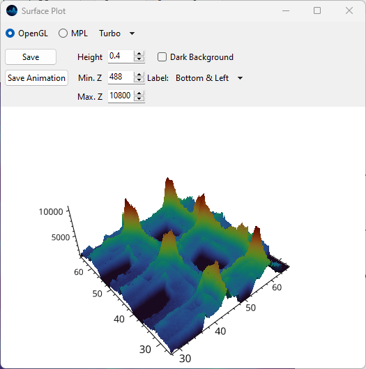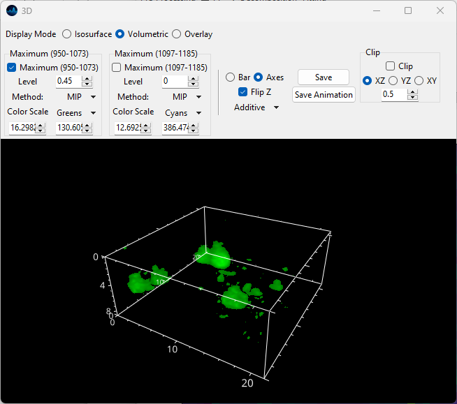 Animating the 3D volumetric data can help to visualize the depth of the data. SMDExplorer allows animating the rotation about the X, Y, or Z axes. Animations can be saved as a single file (animated PNG, GIF, or animated WebP) or as a series of images that can be converted into a video using 3rd party software.