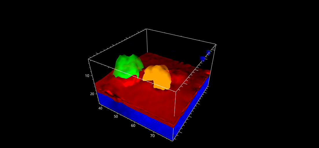 Isosurfaces are the three-dimensional analog of isolines. They represent a surface of constant value in an intensity voxel.