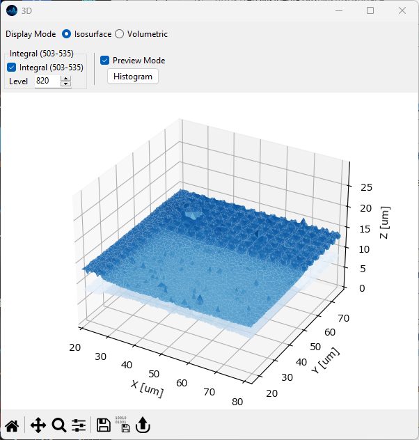 Displays an intensity distribution of the intensity values in the 3D voxel. This can help selecting an appropriate intensity value for the isosurface.