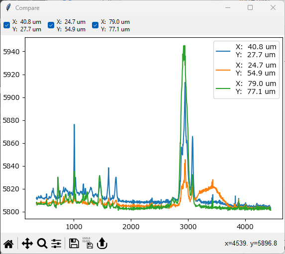 Different spectra obtained during a mapping / time scan can be compared by clicking the Compare Spectra button in the Mapping window toolbar or by selecting the menu item. This opens a new window and appends the currently displayed spectrum. Multiple spectra can be added as desired.