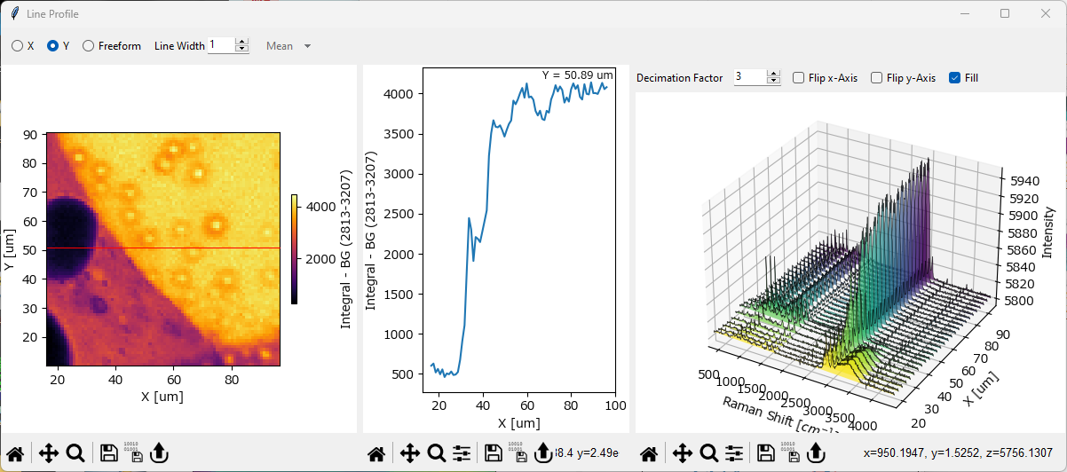 The Line Profile pane (center). This contains the intensity profile, i.e. the values of the datapoints that fall on the user-selected line. The coordinate(s) of the plotted profile are displayed in this graph.