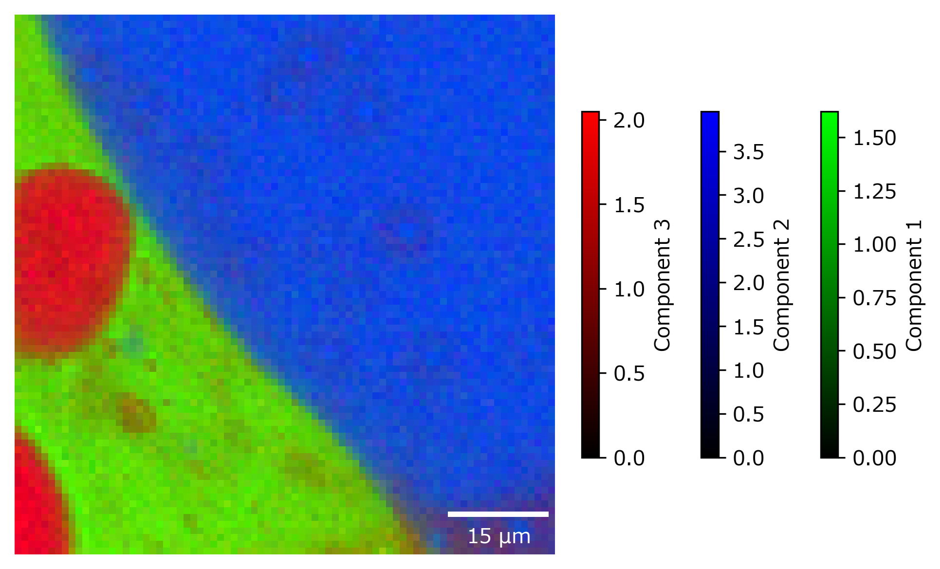 In slice overlay mode, the 2D distribution of different components in a selected plane of a 3D volume can be visualized. This is the three-dimensional extension of the 2D overlay view and mirrors the controls found in the 3D mapping view.