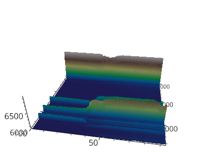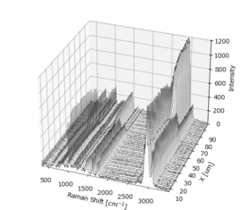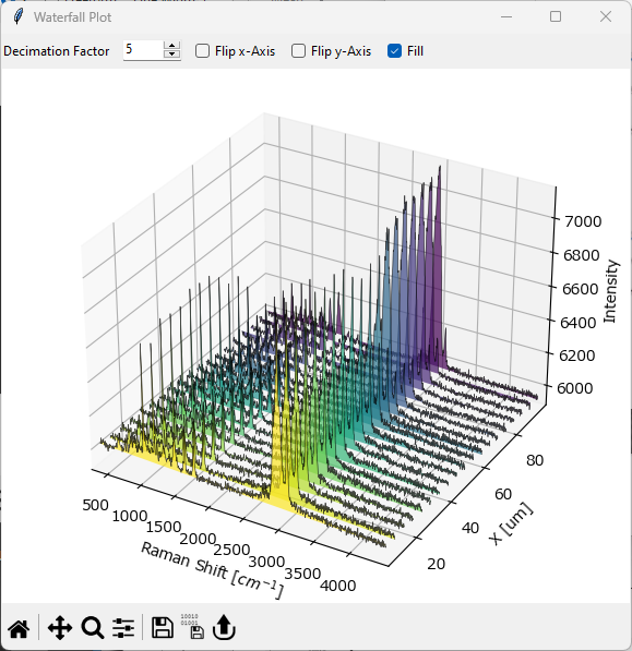 Displays a waterfall plot of the spectra that correspond to the locations displayed in the profile. The spectral data displayed in the waterfall plot can be exported allowing flexible extraction of data from 3D or 2D-temporal scans.